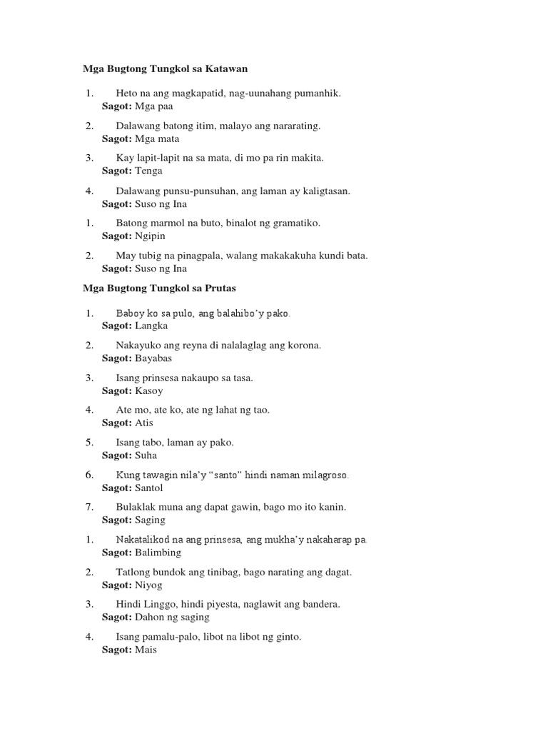 Kayat ang bugtong ay masasabi din na nakapaghahanda sa atin para makagawa ng mga mahahalagang desisiyon sa buhay sa pamamagitan ng maingat na pag-iisip at ng may katalinuhan. View Mga Bugtong Tungkol sa Katawandocx from BSE 103 at Taguig City University. TALAANNGNILALAMAN ALAMAT AlamatngLamok AlamatngIbongMaya AlamatngMakahiya MAIKLINGKWENTO NilubidnaAbo ModelongBata DalawangLapis TULA LahingMatapang NanayatTatay MalayongPaaralan KWENTONGBAYAN AngPunongKawayan AngKalabasaatAngDuhat SiMariangMapangarapin PABULA AngKabayoatAngKalabaw AngUwaknaNagpanggap AngAsoatAngKanyangAnino BUGTONG.