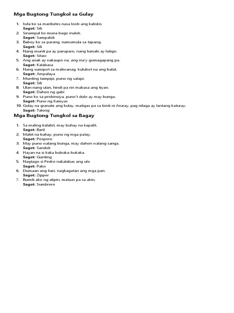 Ang mga ito ay angkop para sa mga bata sa paaralan at mga bata 7 taong. BUGTONG BUGTONG A Bugtong or riddle could be a direct statement phrase or question that has a hidden meaning presented as a puzzle to be analyzed. This Sliding Bar can be switched on or off in theme options and can take any widget you throw at it or even fill it with your custom HTML Code.
