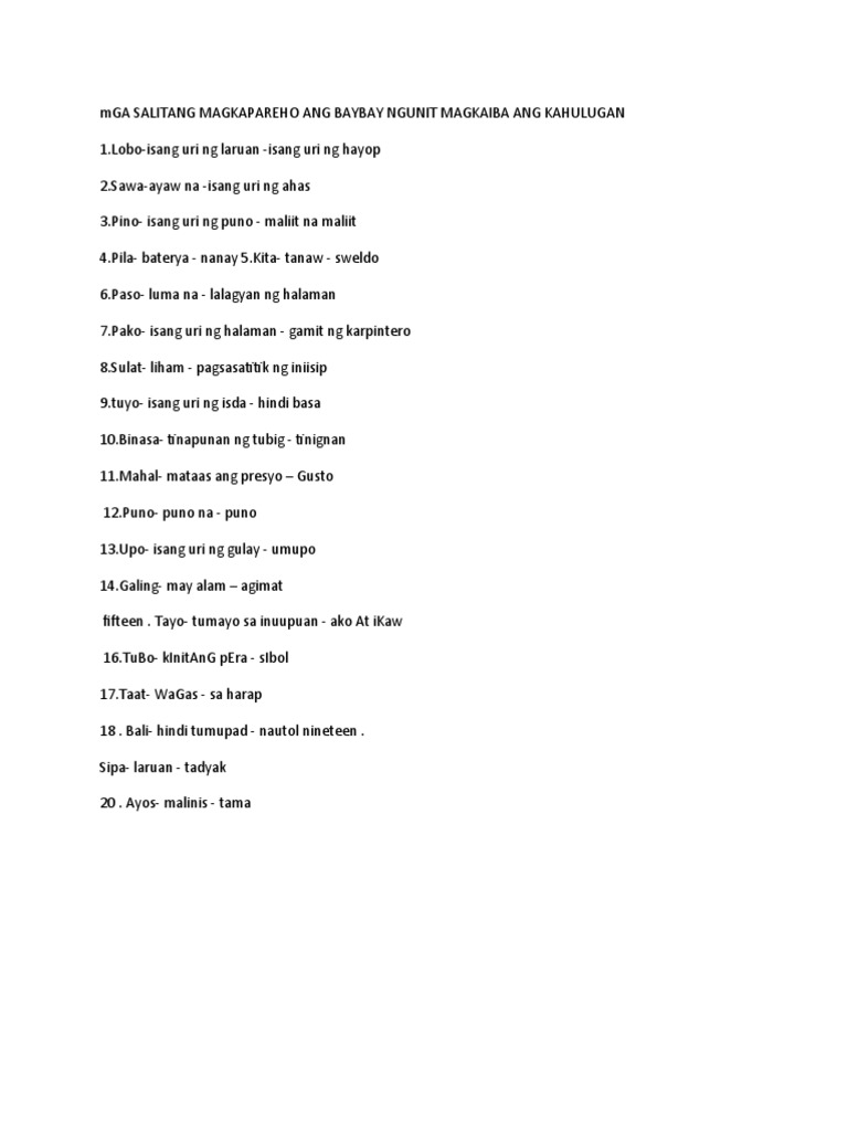 Worksheet will open in a new window. Binasa-tinapunanngtubig-tinignan MGA SALITANG MAGKAPAREHO ANG BAYBAY NGUNIT MAGKAIBA ANG KAHULUGAN 1Lobo-isang uri ng laruan -isang uri ng hayop 2Sawa-ayaw na -isang uri ng ahas 3Pino- isang uri ng puno - maliit na maliit 4Pila- baterya - nanay 5Kita- tanaw - sweldo 6Paso- luma na - lalagyan ng halaman 7Pako- isang uri ng halaman - gamit ng karpintero 8Sulat- liham - pagsasatitik ng. Narito ang 100 halimbawa ng mga matalinghagang salita na tiyak magbibigay ng gintong aral bata man o matanda.
