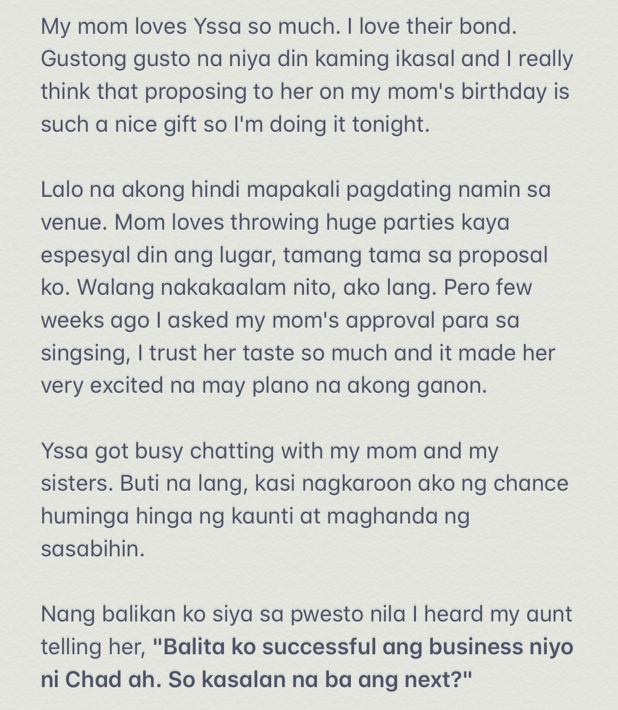 Pakatatag ka makagwapo nandito kami mga sumusuporta sayo. Alam ko na malayo tayo sa isat isa. Yung papayagan ako sumama sa mga barkada ko at ganon din ako sa kanya.